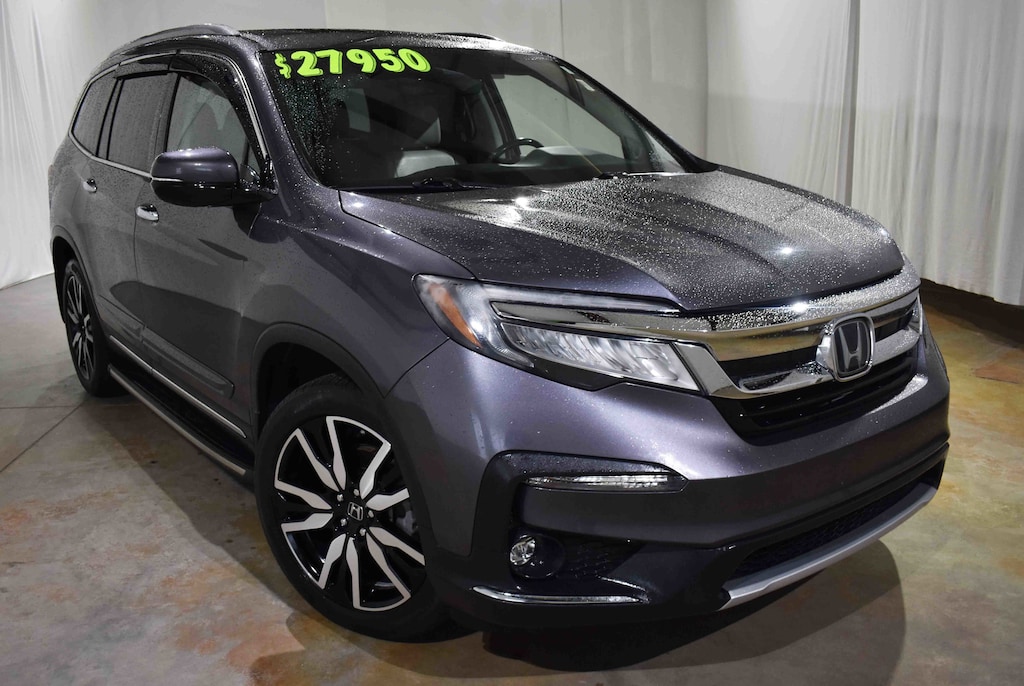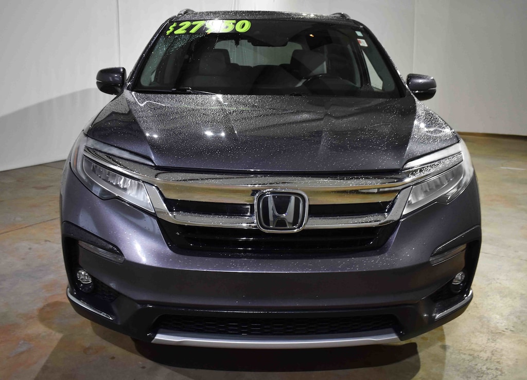 Modern Steel Metallic 2019 Honda Pilot Elite AWD 9-Speed Automatic 3.5L V6 24V SOHC i-VTEC 10 Speakers, 3rd row seats: split-bench, 4-Wheel Disc Brakes, 4.334 Axle Ratio, A/V remote: CabinControl, ABS brakes, Air Conditioning, Alloy wheels, AM/FM radio: SiriusXM, Apple CarPlay/Android Auto, Auto High-beam Headlights, Auto-dimming door mirrors, Auto-dimming Rear-View mirror, Automatic temperature control, Blind Spot Information (BSI) System warning, Brake assist, Bumpers: body-color, Compass, Delay-off headlights, Dual front impact airbags, Dual front side impact airbags, Electronic Stability Control, Emergency communication system: HondaLink, Exterior Parking Camera Rear, Forward collision: Collision Mitigation Braking System (CMBS) + FCW mitigation, Four wheel independent suspension, Front anti-roll bar, Front dual zone A/C, Front fog lights, Fully automatic headlights, Garage door transmitter: HomeLink, Headphones, Heated & Ventilated Front Bucket Seats, Heated door mirrors, Heated front seats, Heated rear seats, Heated steering wheel, Illuminated entry, Lane departure: Lane Keeping Assist System (LKAS) active, Low tire pressure warning, Memory seat, Navigation system: Honda Satellite-Linked Navigation System, Occupant sensing airbag, Outside temperature display, Overhead airbag, Panic alarm, Perforated Leather-Trimmed Seats, Power door mirrors, Power driver seat, Power Liftgate, Power moonroof, Power passenger seat, Power steering, Power windows, Radio data system, Radio: AM/FM Premium Audio System, Rain sensing wipers, Rear air conditioning, Rear anti-roll bar, Rear reading lights, Rear window defroster, Rear window wiper, Reclining 3rd row seat, Remote keyless entry, Roof rack: rails only, Security system, Speed control, Speed-sensing steering, Speed-Sensitive Wipers, Split folding rear seat, Spoiler, Steering wheel mounted audio controls, Tachometer, Telescoping steering wheel, Tilt steering wheel, Traction control, Trip computer, Turn signal indicator mirrors, Variably intermittent wipers, Ventilated front seats, Wheels: 20" Machine-Finished Alloy.