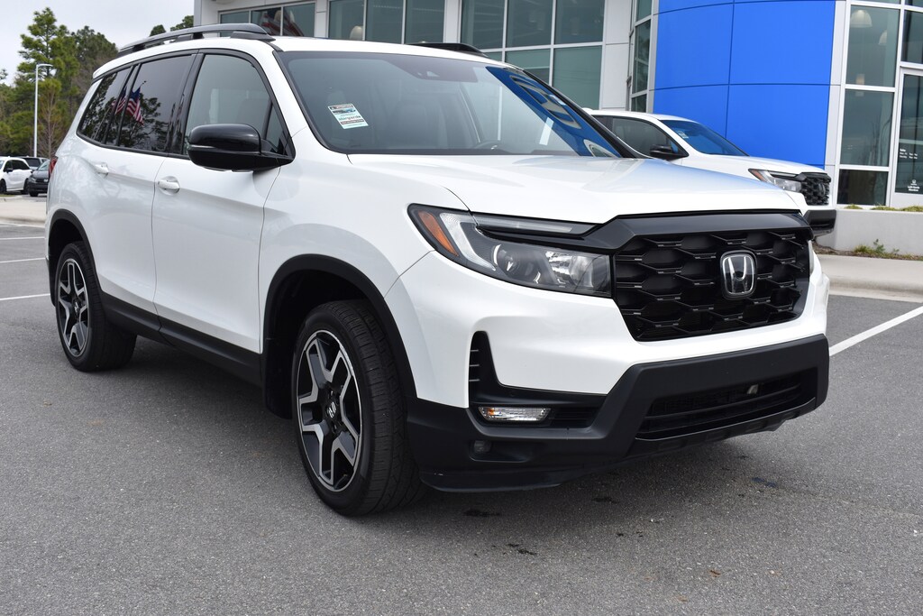 Clean CARFAX. CARFAX One-Owner. Certified. Platinum White Pearl 2022 Honda Passport Elite AWD 9-Speed Automatic 3.5L V6 24V SOHC i-VTEC 10 Speakers, 4-Wheel Disc Brakes, 4.334 Axle Ratio, A/V remote: CabinControl, ABS brakes, Air Conditioning, Alloy wheels, AM/FM radio: SiriusXM, Apple CarPlay/Android Auto, Auto High-beam Headlights, Auto-dimming door mirrors, Auto-dimming Rear-View mirror, Automatic temperature control, Blind Spot Information (BSI) System warning, Brake assist, Bumpers: body-color, Compass, Delay-off headlights, Driver's Seat Mounted Armrest, Dual front impact airbags, Dual front side impact airbags, Electronic Stability Control, Emergency communication system: HondaLink, Exterior Parking Camera Rear, Forward collision: Collision Mitigation Braking System (CMBS) + FCW mitigation, Four wheel independent suspension, Front anti-roll bar, Front dual zone A/C, Front fog lights, Fully automatic headlights, Garage door transmitter: HomeLink, Heated & Ventilated Front Bucket Seats, Heated door mirrors, Heated front seats, Heated rear seats, Heated steering wheel, Illuminated entry, Lane departure: Lane Keeping Assist System (LKAS) active, Low tire pressure warning, Memory seat, Navigation system: Honda Satellite-Linked Navigation System, Occupant sensing airbag, Outside temperature display, Overhead airbag, Panic alarm, Perforated Leather-Trimmed Seats, Power door mirrors, Power driver seat, Power Liftgate, Power moonroof, Power passenger seat, Power steering, Power windows, Radio data system, Radio: 540-Watt Premium Audio System w/10 Speakers, Rain sensing wipers, Rear air conditioning, Rear anti-roll bar, Rear seat center armrest, Rear window defroster, Rear window wiper, Remote keyless entry, Roof rack: rails only, Security system, Speed control, Speed-sensing steering, Split folding rear seat, Spoiler, Steering wheel mounted audio controls, Tachometer, Telescoping steering wheel, Tilt steering wheel, Traction control, Trip computer, Turn signal indicator mirrors, Variably intermittent wipers, Ventilated front seats, Wheels: 20" Machined-Finish Alloy.