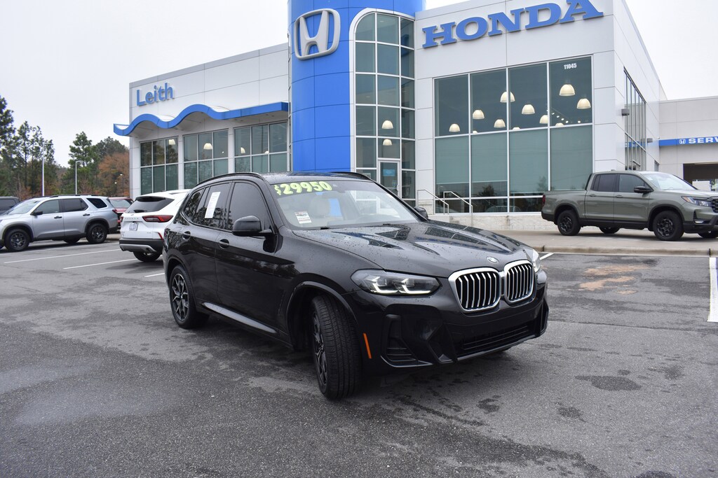 CARFAX One-Owner. Black Sapphire Metallic 2022 BMW X3 xDrive30i AWD 8-Speed Automatic Sport 2.0L I4 TwinPower Turbo 12 Speakers, 3.385 Axle Ratio, 4-Wheel Disc Brakes, ABS brakes, Aerodynamic Kit, Air Conditioning, Alloy wheels, AM/FM Radio, AM/FM radio: SiriusXM with 360L, Apple CarPlay & Android Auto Compatibility, Auto High-beam Headlights, Auto-dimming door mirrors, Auto-dimming Rear-View mirror, Automatic temperature control, BMW Assist eCall, BMW TeleServices, Brake assist, Bumpers: body-color, Comfort Access Keyless Entry, Connected Package Pro, ConnectedDrive Services, Convenience Package, Delay-off headlights, Dual front impact airbags, Dual front side impact airbags, Electronic Stability Control, Emergency communication system: BMW Assist eCall, Enhanced Bluetooth, Exterior Parking Camera Rear, Four wheel independent suspension, Front anti-roll bar, Front dual zone A/C, Front reading lights, Fully automatic headlights, Garage door transmitter, Genuine wood dashboard insert, Genuine wood door panel insert, Heated door mirrors, Heated Front Seats, Hi-Fi Sound System, Illuminated entry, Lumbar Support, M Shadowline Lights, M Sport Package (337), M Sport Package 2, M Steering Wheel, Memory seat, Navigation, Navigation System, Occupant sensing airbag, Overhead airbag, Panic alarm, Panoramic Moonroof, Perforated SensaTec Upholstery, Power door mirrors, Power driver seat, Power Front Seats, Power Liftgate, Power passenger seat, Power steering, Power windows, Radio data system, Rain sensing wipers, Rear air conditioning, Rear anti-roll bar, Rear window defroster, Rear window wiper, Remote Engine Start, Remote keyless entry, Roof rack: rails only, Roof Rails in High-Gloss Shadowline, Security system, Shadowline Exterior Trim, SiriusXM w/360L, Smoke Grey Aluminum Rhombicle Trim, Speed-sensing steering, Speed-Sensitive Wipers, Split folding rear seat, Spoiler, Sport Seats, Sport steering wheel, Steering wheel mounted audio controls, Tachometer, Telescoping steering wheel, Tilt steering wheel, Traction control, Trip computer, Turn signal indicator mirrors, Variably intermittent wipers, Wheels: 19" x 7.5" M Y-Spoke Bi-Color (Style 887M), Wheels: 20" x 8.0" Fr & 20" x 9.5" Rr (Style 787M), WiFi Hotspot, Without Exterior Lines Designation.