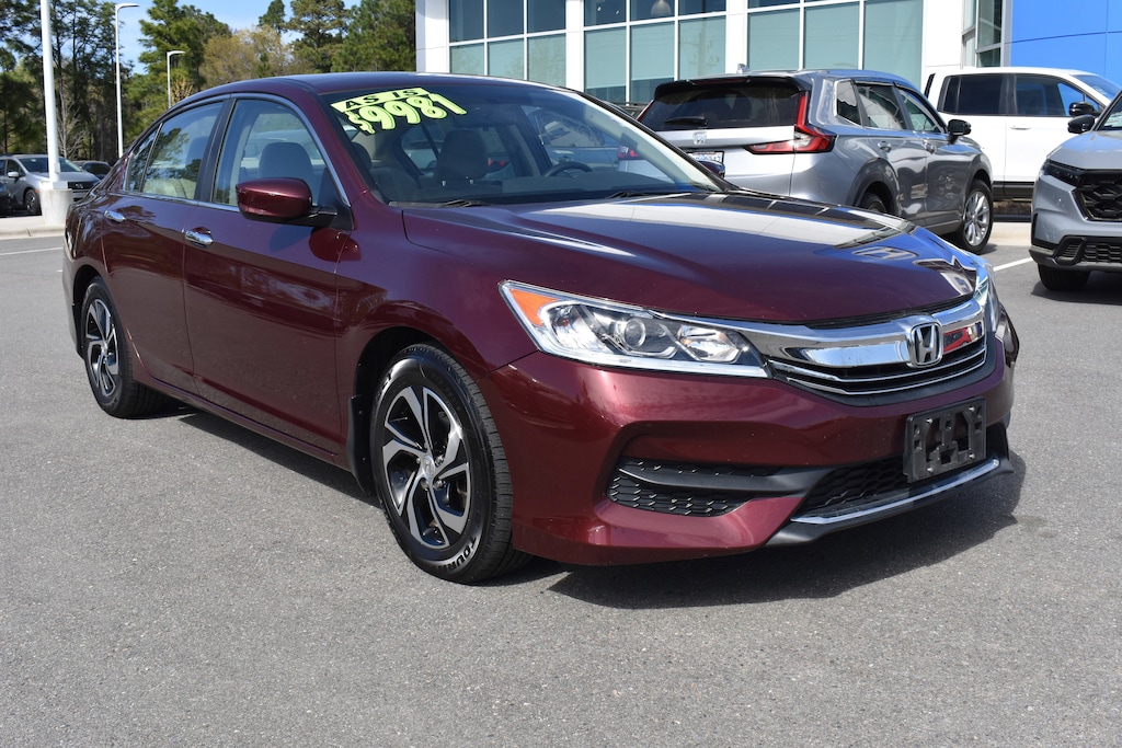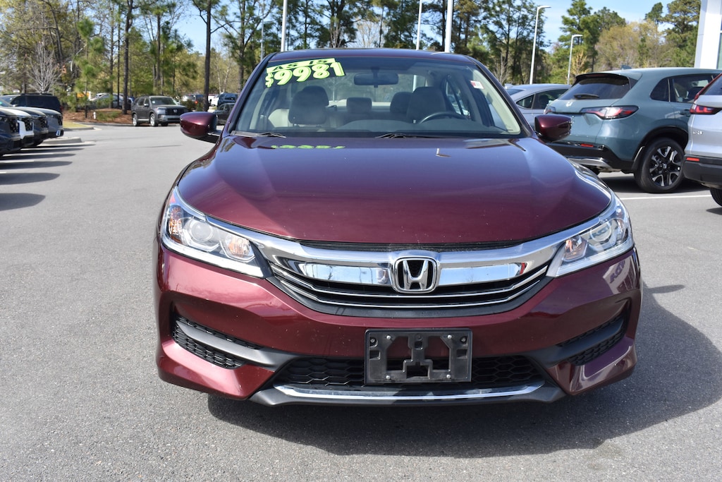 Clean CARFAX. CARFAX One-Owner. Basque Red Pearl II 2017 Honda Accord LX FWD CVT 2.4L I4 DOHC i-VTEC 16V 16" Alloy Wheels, 4 Speakers, 4-Wheel Disc Brakes, ABS brakes, Air Conditioning, Alloy wheels, AM/FM radio, Automatic temperature control, Brake assist, Bumpers: body-color, CD player, Cloth Seat Trim, Delay-off headlights, Dual front impact airbags, Dual front side impact airbags, Electronic Stability Control, Exterior Parking Camera Rear, Four wheel independent suspension, Front anti-roll bar, Front Bucket Seats, Front dual zone A/C, Fully automatic headlights, Illuminated entry, Leather Shift Knob, Low tire pressure warning, Occupant sensing airbag, Outside temperature display, Overhead airbag, Panic alarm, Power door mirrors, Power steering, Power windows, Radio data system, Radio: 160-Watt AM/FM Audio System, Rear anti-roll bar, Rear window defroster, Remote keyless entry, Security system, Speed control, Speed-sensing steering, Speed-Sensitive Wipers, Steering wheel mounted audio controls, Tachometer, Telescoping steering wheel, Tilt steering wheel, Traction control, Trip computer, Variably intermittent wipers.