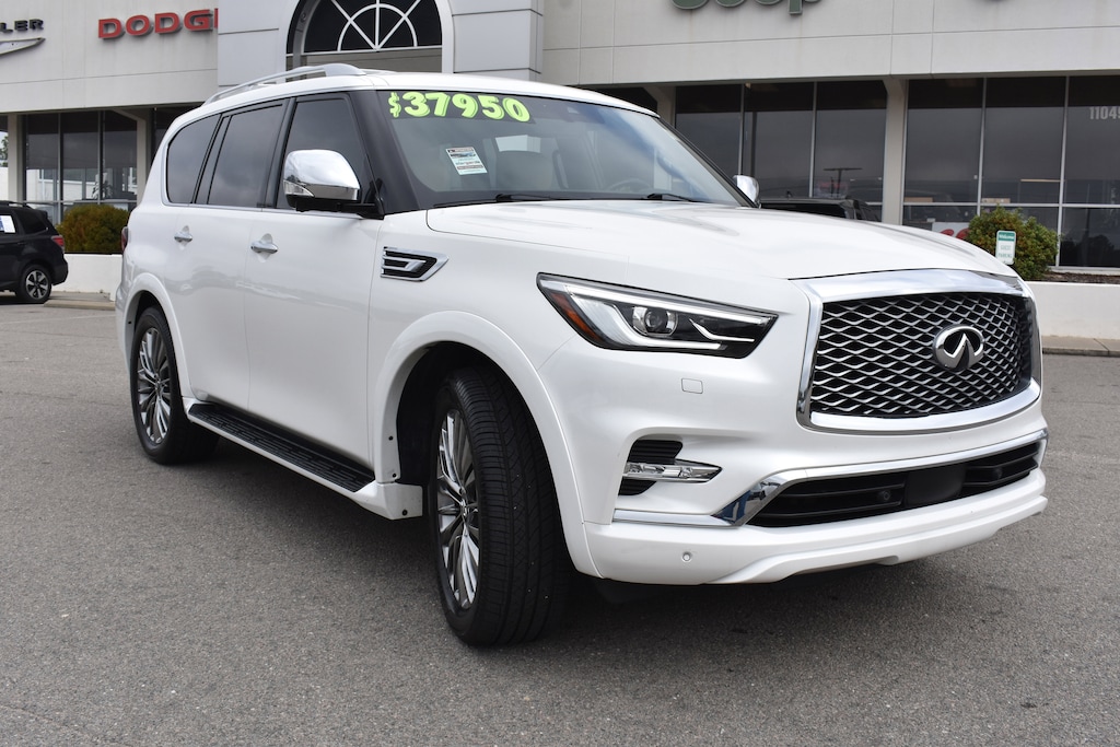 Clean CARFAX. Moonstone White 2021 INFINITI QX80 Sensory 4WD 7-Speed Automatic 5.6L V8 17 Speakers, 2.937 Axle Ratio, 3rd row seats: split-bench, 4-Wheel Disc Brakes, A/V remote, ABS brakes, Air Conditioning, All-Season Floor Mats, All-Season Package, Alloy wheels, AM/FM radio: SiriusXM, Anti-whiplash front head restraints, Apple CarPlay/Android Auto, Auto High-beam Headlights, Auto tilt-away steering wheel, Auto-dimming door mirrors, Auto-dimming Rear-View mirror, Auto-leveling suspension, Automatic temperature control, Brake assist, Bumpers: body-color, Cargo Package, Cargo Protector, CD player, Climate Controlled Front Bucket Seats, Compass, Delay-off headlights, DVD-Audio, Electronic Stability Control, Emergency communication system: INFINITI Connection, First-Aid Kit, Four wheel independent suspension, Front anti-roll bar, Front dual zone A/C, Front fog lights, Fully automatic headlights, Garage door transmitter: HomeLink, Headlight cleaning, Headphones, Heated door mirrors, Heated front seats, Heated rear seats, Heated steering wheel, High-Density Non-Slip Rear Cargo Carpet, Illuminated entry, Leather Shift Knob, Leather steering wheel, Literature Kit, Low tire pressure warning, Memory seat, Navigation system: INFINITI InTouch Navigation, Nylon-Cord Cargo Net, Occupant sensing airbag, Outside temperature display, Overhead airbag, Panic alarm, Power door mirrors, Power driver seat, Power Liftgate, Power moonroof, Power passenger seat, Power steering, Power windows, Radiant Illuminated Kick Plates, Radio data system, Radio: Bose Performance Audio System w/17 Speakers, Rain sensing wipers, Rear air conditioning, Rear anti-roll bar, Rear audio controls, Rear reading lights, Rear seat center armrest, Rear window defroster, Rear window wiper, Reclining 3rd row seat, Remote keyless entry, Roof Rail Cross Bars, Security system, Semi-Aniline Leather Appointed Seats, Speed control, Speed-sensing steering, Split folding rear seat, Spoiler, Steering wheel memory, Steering wheel mounted audio controls, Tachometer, Telescoping steering wheel, Tilt steering wheel, Traction control, Trip computer, Turn signal indicator mirrors, Variably intermittent wipers, Ventilated front seats, Voltmeter, Welcome Lighting, Wheels: 22" x 8.0" Forged Aluminum-Alloy.