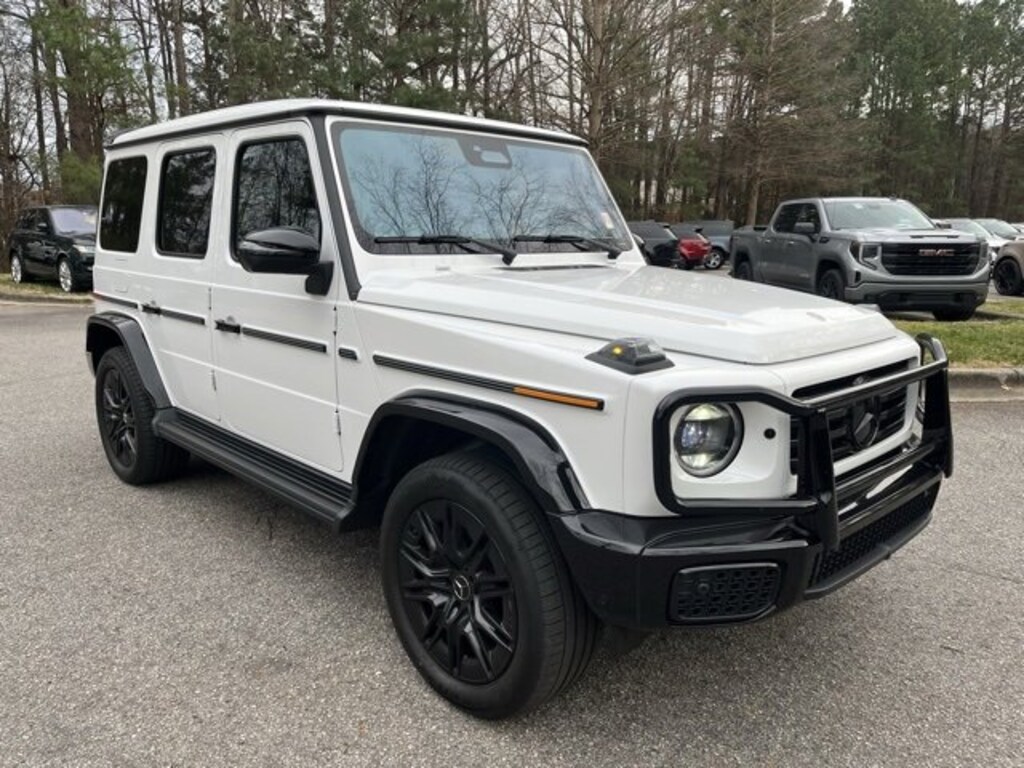 MANUFAKTUR Moonlight White Metallic 2025 Mercedes-Benz G-Class G 550 4MATIC® 4MATIC® 9-Speed Automatic 3.0L I6 Turbo AMG® Floor Mats, AMG® Line, Exclusive Interior Package, Exterior Lettering in Black, Exterior Protective Strip with Black Trim Insert, Exterior Protective Strips with Trim Insert, Front and Rear Black MB Star, Front Brake Calipers with Mercedes-Benz Lettering, MANUFAKTUR Black Running Boards, MANUFAKTUR Interior Package, Multifunction Sports Steering Wheel in Nappa Leather, Night Package Plus, Roof in Obsidian Black, Seat Comfort Package, Spare Wheel Cover Ring in Obsidian Black, Sporty Engine Sound, Trailer Manoeuvring Assist, Wheel Arches and Bumpers in Black, Wheels: 20" AMG® Black 10-Spoke Alloy.